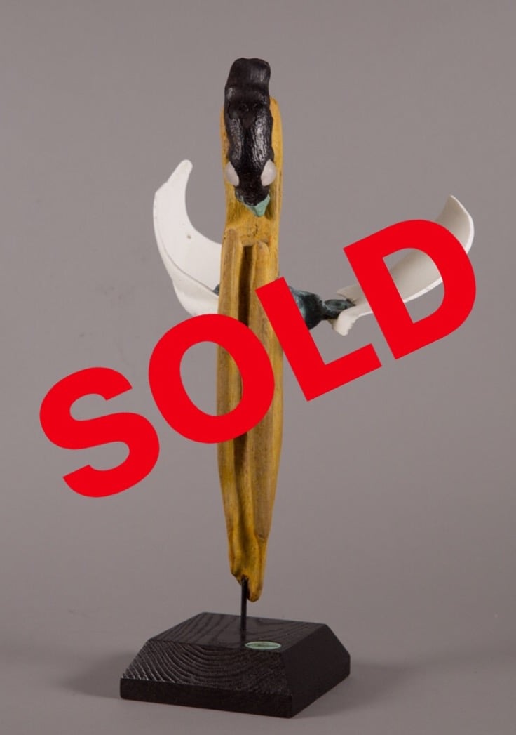 HEAD: carbonized chunk of driftwood found in Cayo Cruz, Cuba ✦ EYES: lucite spheres ✦ NOSE: bronzed taxidermy fox nose ✦ WING JOINT: drift-plastic Cayo Cruz, Cuba ✦ WINGS: sun bleached hard hat Cayo Cruz, Cuba ✦ TORSO: drift wood found on Cayo Cruz, Cuba and stained with turmeric