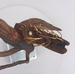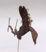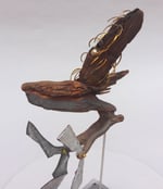 HEAD: found drift wood Ventura, CA ✦ EYES: plastic silver beads from toy necklace ✦ HAIR: brass trimmings from 22 gauge brass sheet ✦ BODY/RIGHT WING: redwood driftwood Ventura, CA ✦ LEFT WING: piece of pine found in Arrowhead, CA. ✦ LEGS: branch Los Angeles, CA ✦ TALONS: plastic bits, street finds Los Angeles, CA ✦ SIGNATURE: brass tag stamped with official CRUarts signature