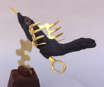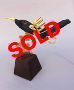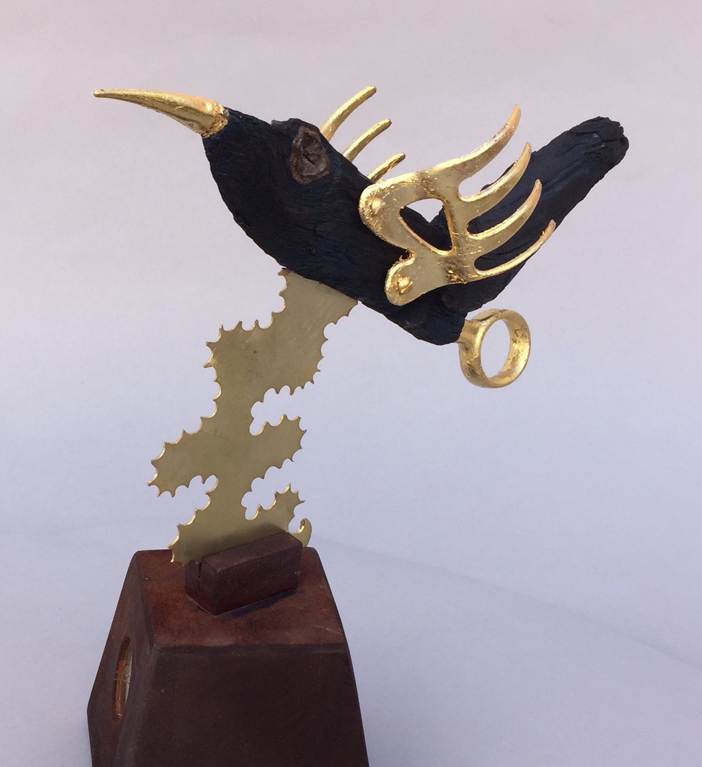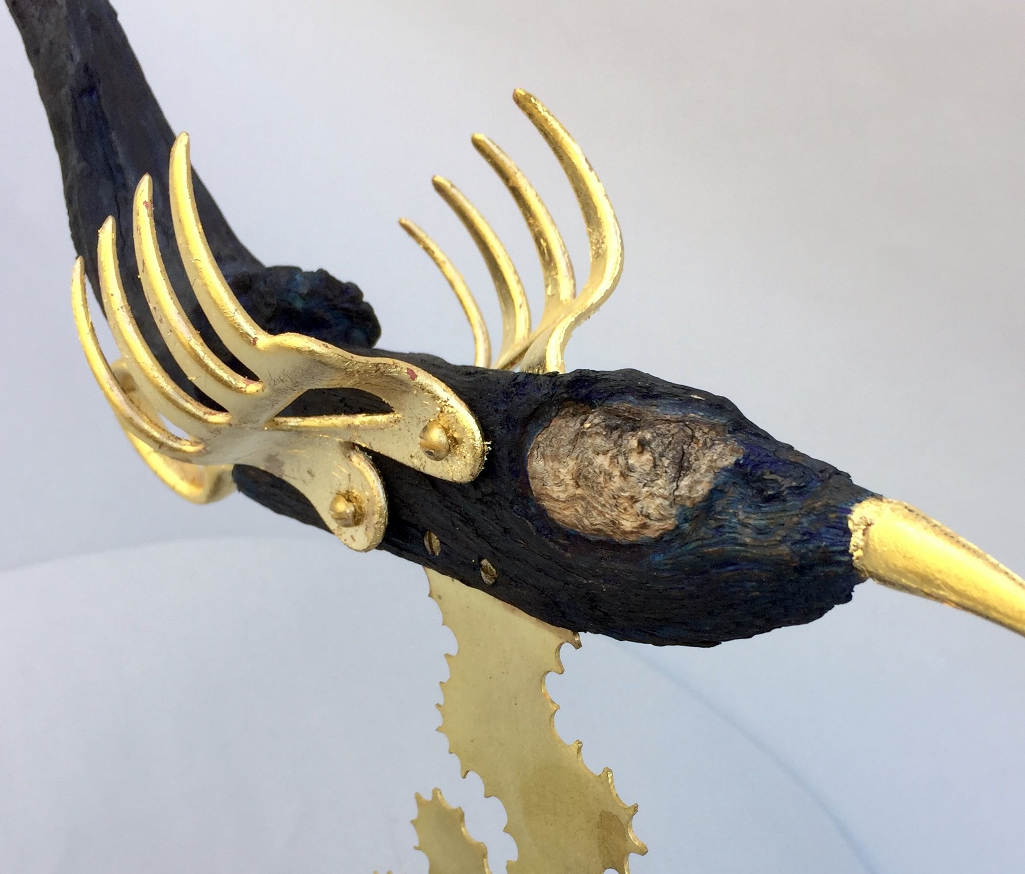 BODY & HEAD: found drift wood Cuba ✦ TAIL: pine wood from Angeles Forest ✦ TAIL UNDER-CARRIAGE: plastic scissors handle. Street find Los Angeles ✦ BEAK: Chinese plastic ornament Chinatown, Los Angeles ✦ TURBULENCE: 24 gauge brass plate ✦ BASE: portion of table leg ✦ SIGNATURE: brass tag stamped with official CRUarts signature